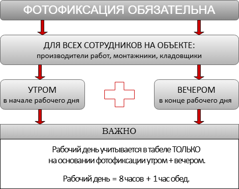 Ответственный за дисциплину и посещаемость на объекте - прораб. Если монтажник, по каким-то причинам, не производит фотофиксацию на рабочем месте, то прораб обязан выяснить и устранить эти причины.