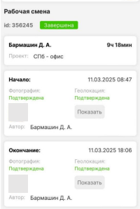 Пройдите сканирование лица и геолокации по аналогии с началом смены |